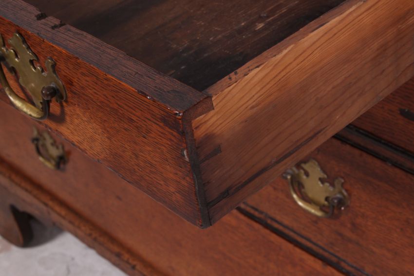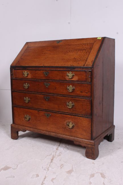 A 19th century Georgian country oak bureau desk raised on bracket feet with fully appointed interior, raised over a chest of drawers.