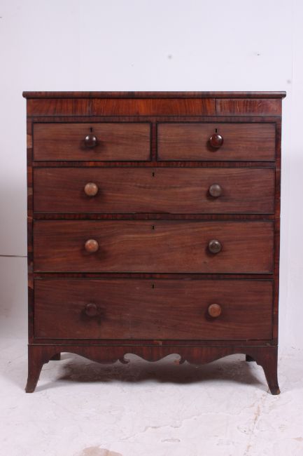 A Victorian mahogany chest of drawers raised on bracket feet with 2 short over 3 deep drawers each with knob handles. The chest ideal for tight stairways/spaces as dismantles to 2 pieces H120cm