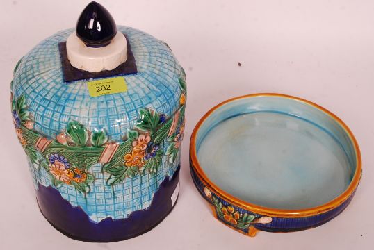 A 20th century majolica George Jones style cheese dish of barrel form, with stamp to base 1731.