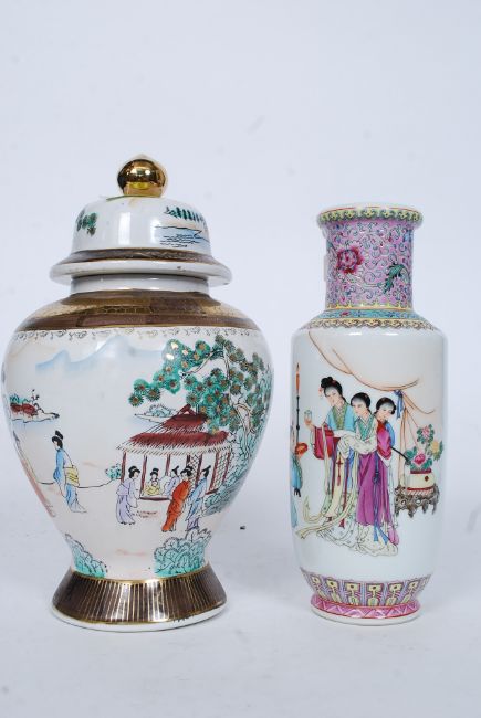 Two Chinese ? vases the first being a large ginger jar having geisha and floral scenes along with another