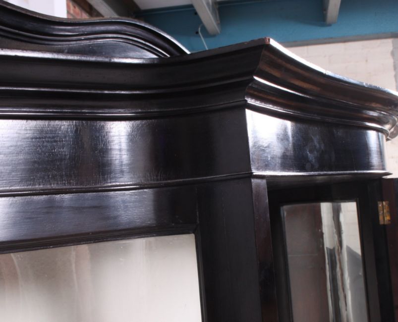 A 19th century Victorian ebonised mahogany serpentine fronted glass bookcase / display cabinet. Cabriole legs with central door, shaped glass panels with flared top above H174 W111 D40cm