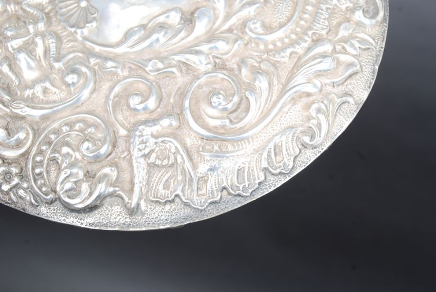 An Edwardian heavy silver hallmarked rococo cherub, dove and green man adorned ladies dressing table mirror bearing hallmarks for Birmingham 1911.