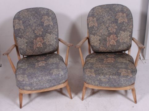 A pair of 1970's retro Ercol beech and elm Windsor pattern armchairs. Raised on stub turned legs with stretchers, shaped arms and original cushions