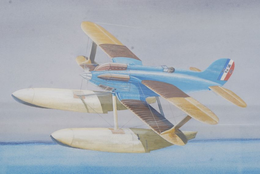 Peter J Stuckey. A Watercolour and Gouache painting of the Gloster 1V Schneider Trophy Contenstant 1927. Signed to the corner by the artist with further notation to verso. Framed and glazed, Flight Lt S.M. Kinkead was forced to retire from the contestant in the sixth lap due to a sheared propeller shaft.
