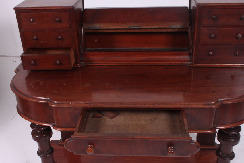 A Victorian mahogany duchess writing table desk. Raised on turned legs with gallery back having drawers and hinged central sectional box H101 W121 D57cm