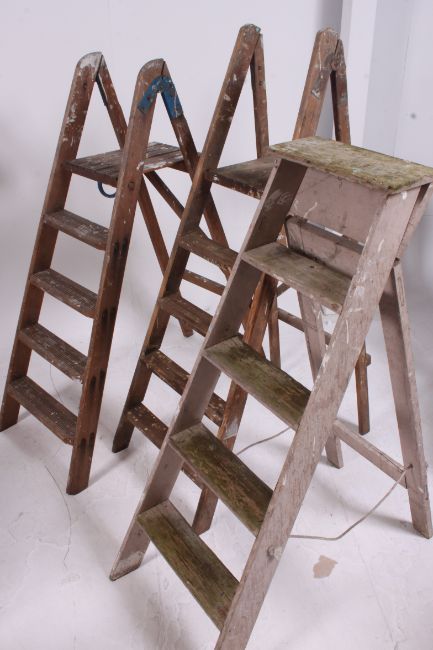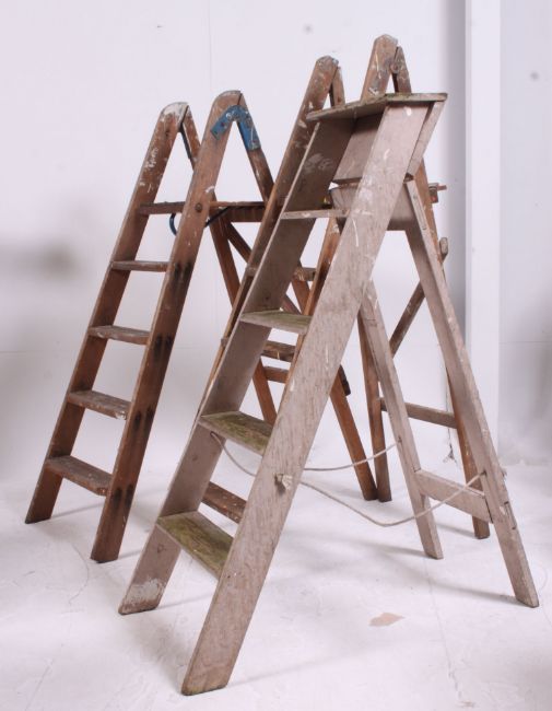 3 vintage wooden 20th century ladders of various shapes etc ( see illustration ) H131