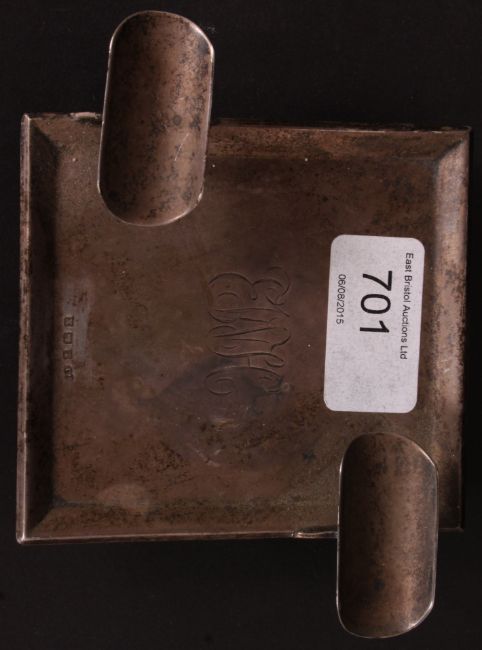A silver hallmarked ashtray by Deakin & Francis. Of square form with raised cigarette rests. Chased monogram to centre raised on shaped legs. Birmingham 1922