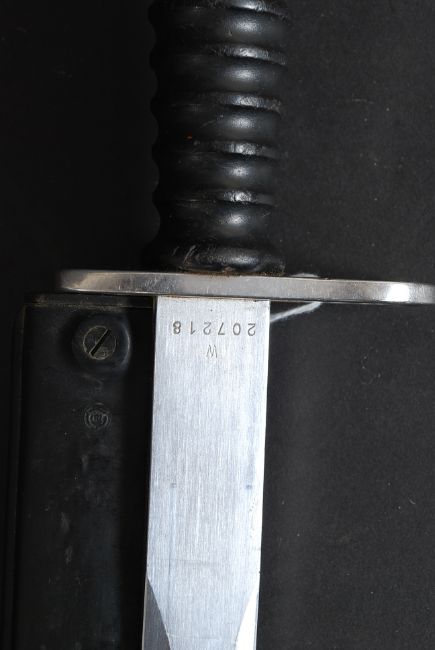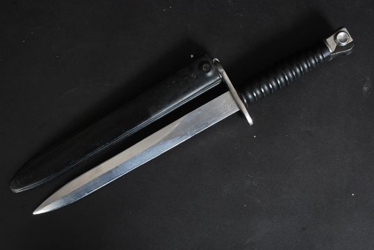 A 20th century Dutch Army bayonet dagger complete with composite scabbard. The shaped blade marked F+ with additional marks KV146