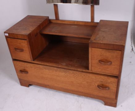 A 1930's Art Deco oak drop centre dressing table chest. The base with a series of drawers having mirror atop. Matching pair of wardrobes in lot 1029 H138 W109 D45