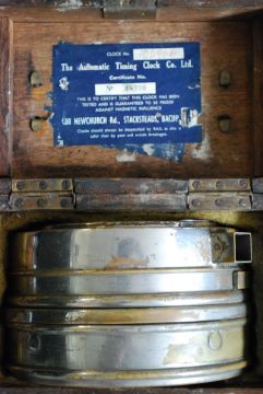 An early 20th century oak cased racing pigeon clock along with a vintage Air Ministry stamped 1939 Rabone leather cased tape measure
