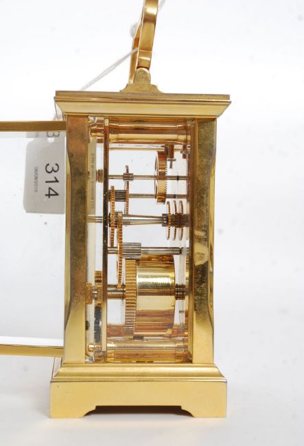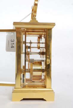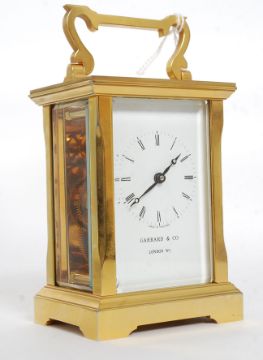 An excellent brass cased carriage clock timepiece having an English 11 jewel movement. The white enamel dial with Roman numerals to the chapter ring with notation to centre for ' Garrard & Co London W1 '