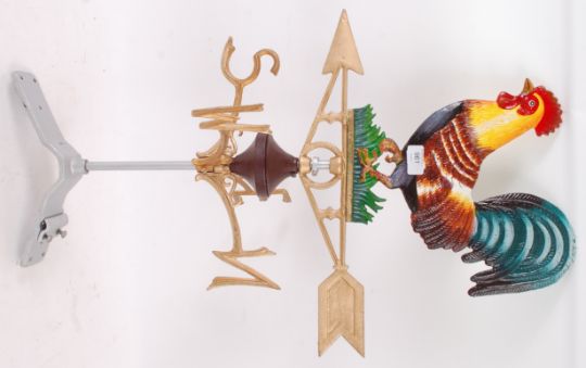 A contemporary heavy cast iron weather vane, with seated cockerel to top and moving pointer to base. Ready for mounting.
