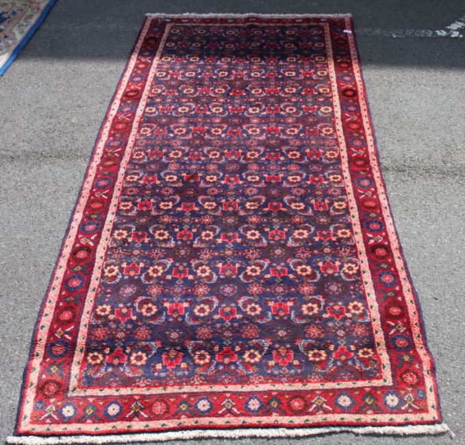A 20th century rug / runner having geometric patterns and boarders too edge