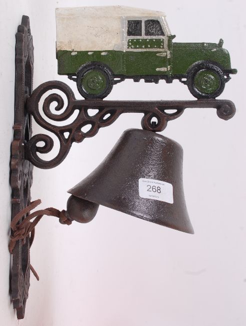 A 20th century cast iron wall hanging bell and bracket, decorated to the top with a Land Rover. Hand painted.