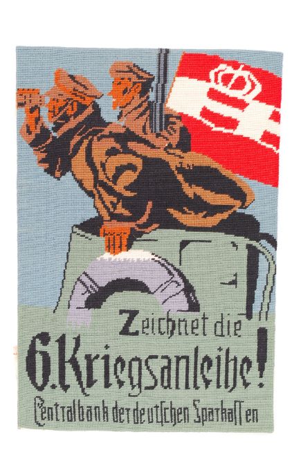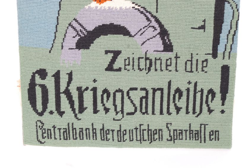 A German ( Austria - Hungary ) WW1 rare needlepoint sampler of a 1917 propaganda poster ' Subscribe to the 6th War Loan! Central Bank of the German savings banks ' A U-Boat captain and crew member stand in a conning tower looking to the left. An Austrian flag flies behind them.