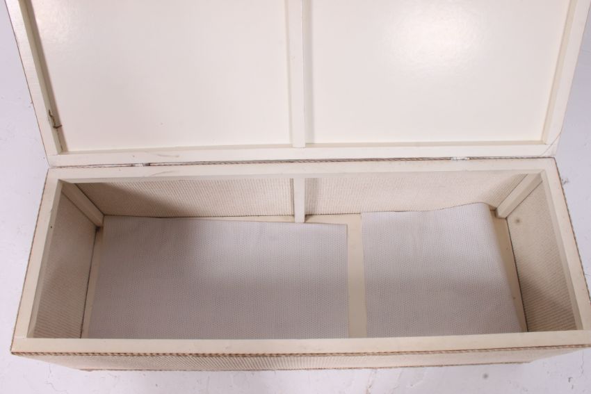 A vintage 1950's good quality chintz upholstered Lloyd Loom style ottoman blanket box with upholstered hinged top H36 W106 D39 cm