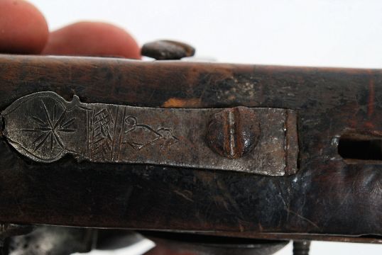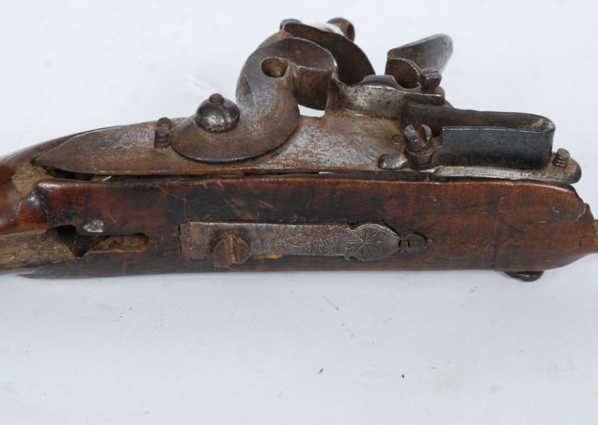 An 18th century flintlock pistol ( af) with unmarked mechanism having wooden stock ( as illustrated )