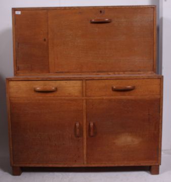 A fabulous 1920's oak school cupboard / cabinet raised on stub tapered supports with cabinet body having upright back with appointed interior ( see illustration )