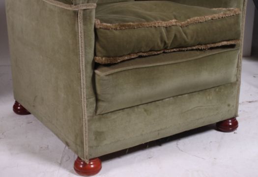 A good quality knoll style early 20th century armchair being upholstered in green velour with rope braid having deep wing backs