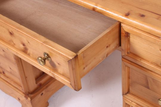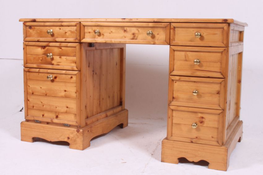 A 20th century antique style pine twin pedestal desk having drawers to each pedestal having flared top above H73 W120 D65 cm.