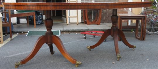 An Edwardian large mahogany twin pedestal regency dining table with addtitional leaves having reeded tripod legs with brass castors