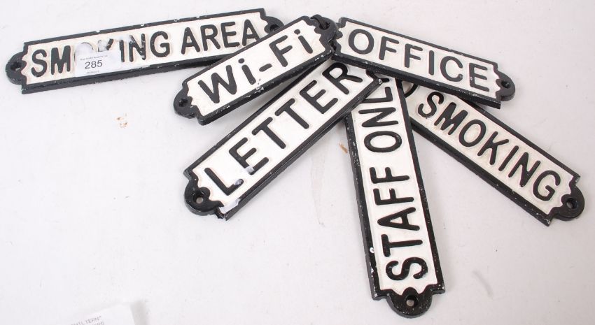 A collection of 6x cast iron wall plaque signs - each with specific notation - Wi Fi, Toilet, Staff etc. Please see images for specific signs