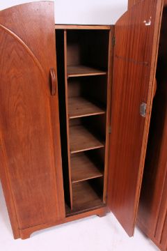 A pair of 1930's Art Deco oak wardrobes. Comprising a ' his and hers ' set with embellished doors having hanging space set within. Matching dressing table in lot 1041 H189 W108 D55cm