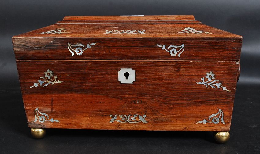 A 19th century rosewood and mother of pearl inlaid tea caddy complete with the 2 caddy inserts and a later pressed glass mixing bowl to the centre