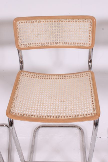 A set of 3 1980's retro caned cantilever Italian bar stools. The chrome cantilever supports with caned seats and back rests. H98 W44 D44 cm