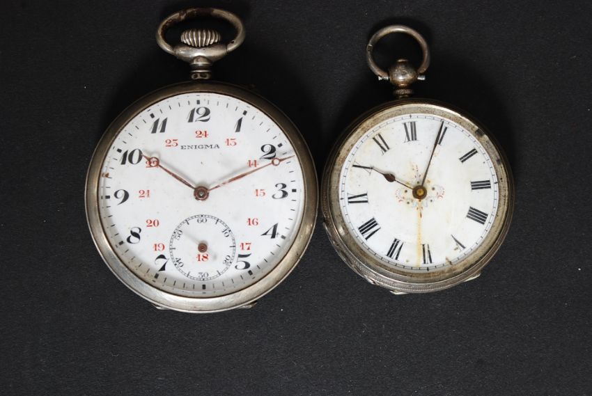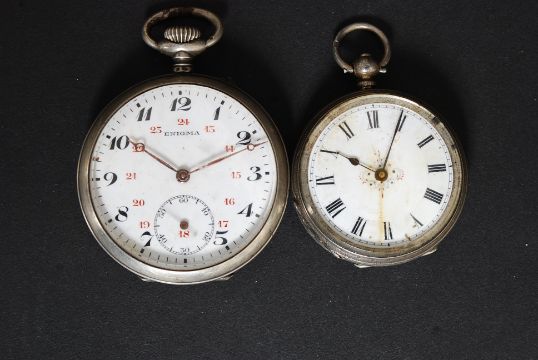 A gents silver stamped 925 open faced pocket watch by Enigma along with a ladies open faced silver pocket watch stamped 800