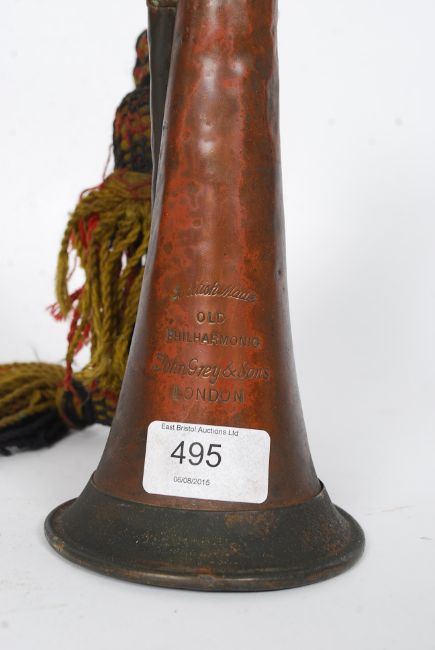 A military copper bugle complete with notation to the top having rope tassels and ties