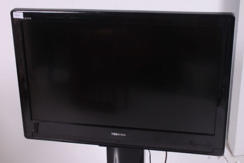 A Toshiba 32" flatscreen Regza model television / tv complete with the contemporary black glass entertainment stand