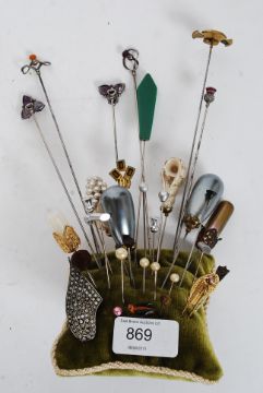 An excellent collection of Victorian and later gold and silver hatpins of differing designs and styles set to a green velvet cushion