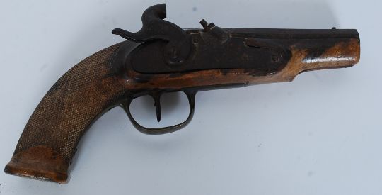 An 18th / 19th century percussion pistol having a shortened barrel and no visible makers marks. Please see images