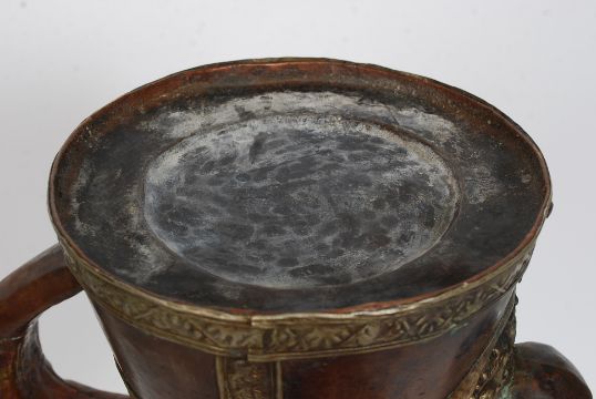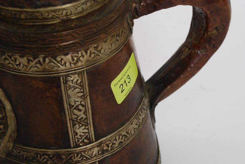 An Islamic copper and white metal coffee / teapot. The copper tapering body with large handle and spout, acorn finial lid above. The white metal embossed banded decoration to sides, centre and spout. It has a 28cms height.
