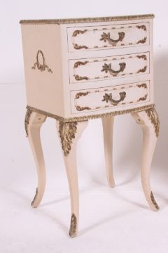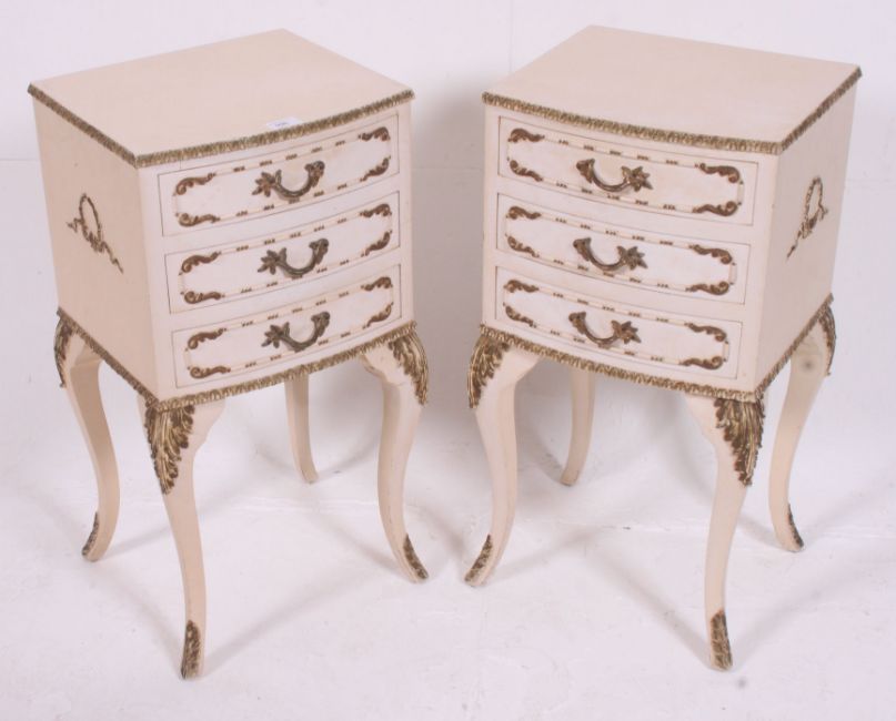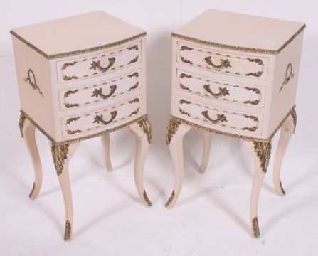 A good quality Louis 15th French shabby chic style pair of bedside chests / cabinets. Raised on slender supports having a series of drawers. All finished with embellished gilded edges. Matching parts of suite in preceding and following lots H69 W36 D33 cm