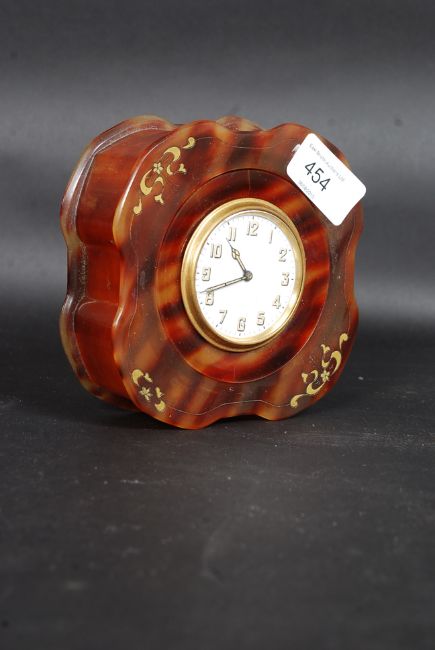 An early 20th century table clock being set within a tortoiseshell case of shaped form, the clock being 8 day swiss movement with an Art Deco facia