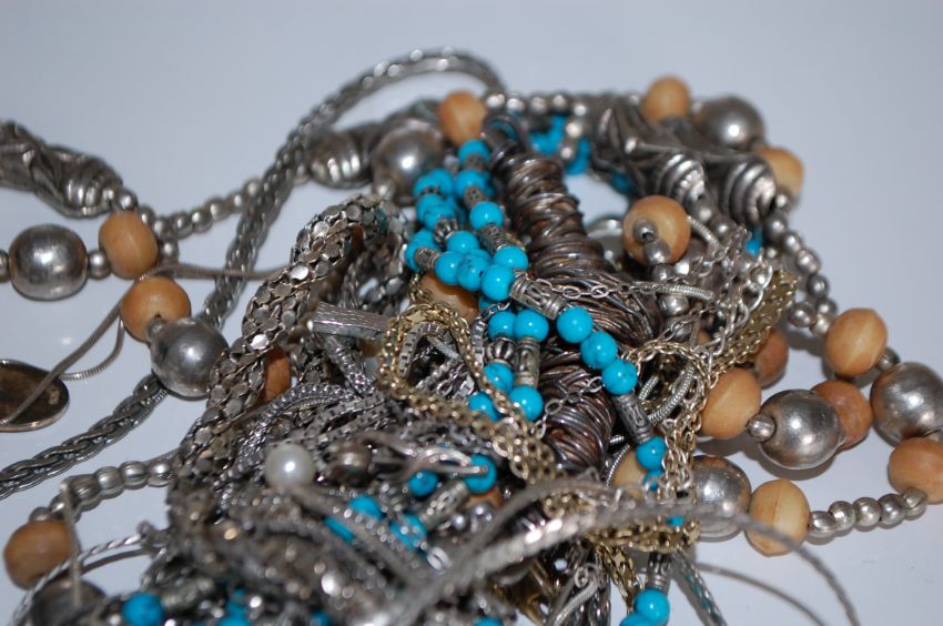 A collection of 16 silver and white metal necklaces one being set with turquoise beads and many others. total weight 170g