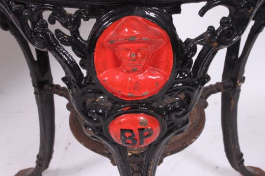 A pair of old cast iron circular pub tavern tables / table having relief cast portrait busts of Baden Powell above a cartouche with the initials BP. Mahogany circular tops above. H74 W63cm
