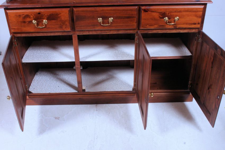 A 20th century contemporary pine dresser having a series of cupboards and drawers with upright top above having glass cabinets. Dismantles 2 pieces for ease of movement H198 W146 D46 cm