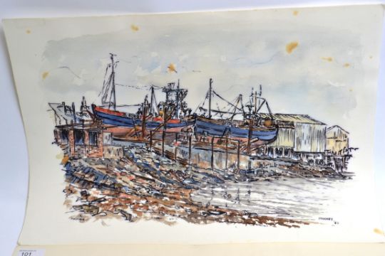 2 maritime watercolours on paper of boats with the tide out. Signed bottom right STUCKEY. 51cm x 36cm. From the extensive portfolio of artist Peter J Stuckey. The entire sale featuring watercolours / oils / sketches / inks / prints and other paintings. Known for his studies of planes, ships and cycles, the sale also features graphic design artwork from his time at Westingate House. Stuckey also designed many greetings cards and some packaging (usually for auto spares) His illustrations also featured as technical drawings and blueprints during his long career. POSTAGE; UK £12.99+VAT, EUROPE £15.99+VAT, WORLDWIDE SEE WEBSITE OR CONTACT US FOR QUOTE. COMBINED POSTAGE AVAILABLE.