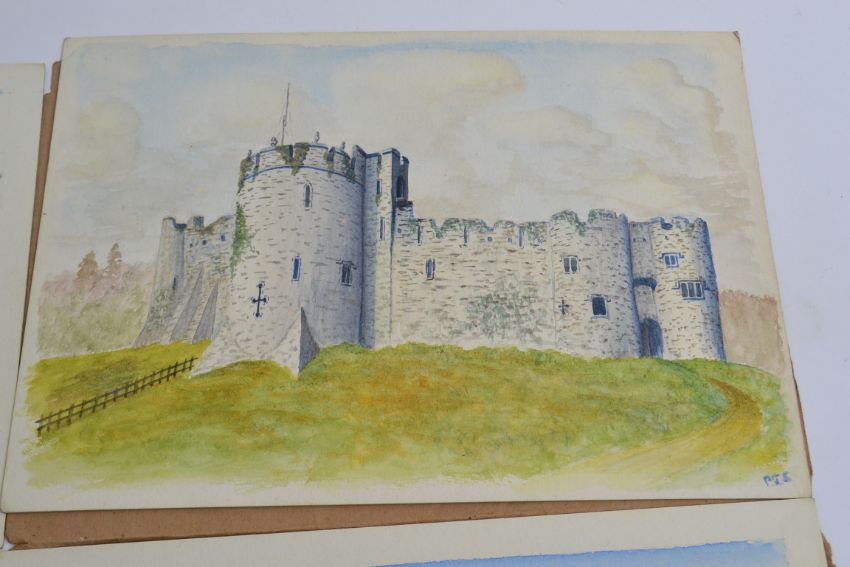 3 watercolours on card, 2 monogrammed P.J.S. one signed P.J.STUCKEY. 2 coastal scenes plus 1 castle 27cm x 19cm. From the extensive portfolio of artist Peter J Stuckey. The entire sale featuring watercolours / oils / sketches / inks / prints and other paintings. Known for his studies of planes, ships and cycles, the sale also features graphic design artwork from his time at Westingate House. Stuckey also designed many greetings cards and some packaging (usually for auto spares) His illustrations also featured as technical drawings and blueprints during his long career. POSTAGE; UK £12.99+VAT, EUROPE £15.99+VAT, WORLDWIDE SEE WEBSITE OR CONTACT US FOR QUOTE. COMBINED POSTAGE AVAILABLE.