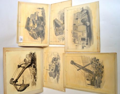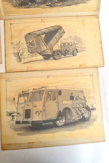 STUCKEY, unsigned. An interesting collection of 6 drawings of industrial vehicles, some prototypes. All around 20cm x 28cm. From the extensive portfolio of artist Peter J Stuckey. The entire sale featuring watercolours / oils / sketches / inks / prints and other paintings. Known for his studies of planes, ships and cycles, the sale also features graphic design artwork from his time at Westingate House. Stuckey also designed many greetings cards and some packaging (usually for auto spares) His illustrations also featured as technical drawings and blueprints during his long career. POSTAGE; UK £12.99+VAT, EUROPE £15.99+VAT, WORLDWIDE SEE WEBSITE OR CONTACT US FOR QUOTE. COMBINED POSTAGE AVAILABLE.