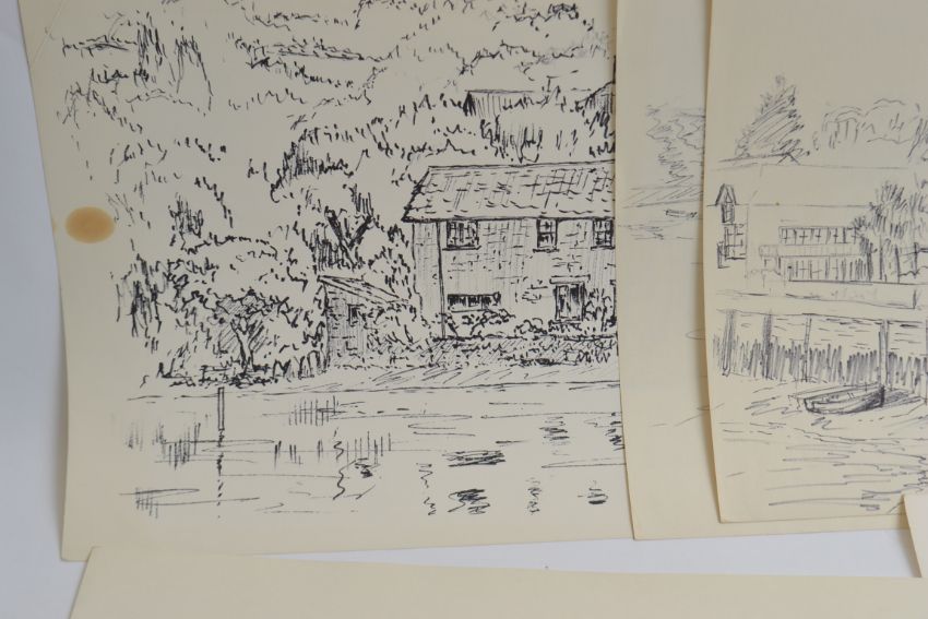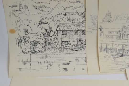 5 unsigned sketches by Stuckey of boat and waterside scenes. Pen and ink on paper . W36cm x L51cm. From the extensive portfolio of artist Peter J Stuckey. The entire sale featuring watercolours / oils / sketches / inks / prints and other paintings. Known for his studies of planes, ships and cycles, the sale also features graphic design artwork from his time at Westingate House. Stuckey also designed many greetings cards and some packaging (usually for auto spares) His illustrations also featured as technical drawings and blueprints during his long career. POSTAGE; UK £12.99+VAT, EUROPE £15.99+VAT, WORLDWIDE SEE WEBSITE OR CONTACT US FOR QUOTE. COMBINED POSTAGE AVAILABLE.
