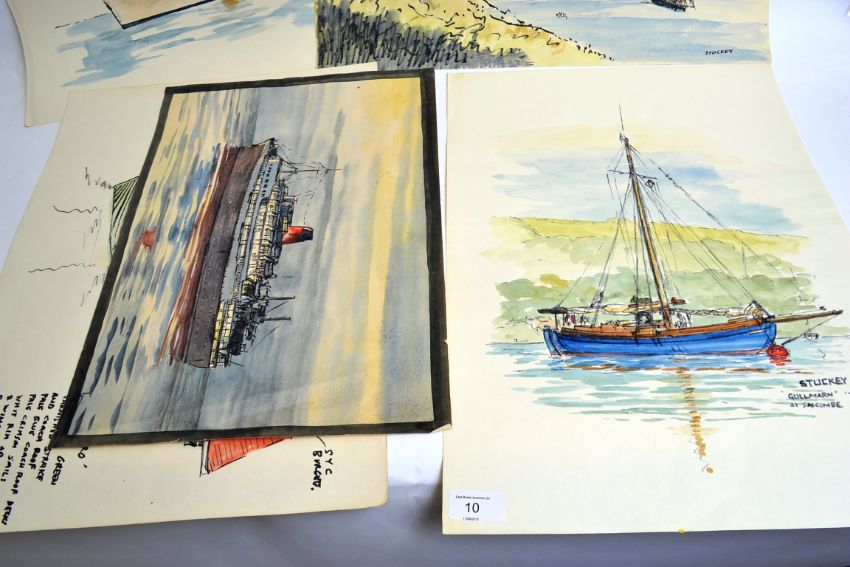 2 watercolours on paper of yacht/coastal scene, both signed STUCKEY to bottom right. Plus 2 unsigned drafts of boats along with an unsigned watercolour of a cruise ship. 4 pictures are W36cm x L51cm the one remaining cruise ship being slightly smaller. From the extensive portfolio of artist Peter J Stuckey. The entire sale featuring watercolours / oils / sketches / inks / prints and other paintings. Known for his studies of planes, ships and cycles, the sale also features graphic design artwork from his time at Westingate House. Stuckey also designed many greetings cards and some packaging (usually for auto spares) His illustrations also featured as technical drawings and blueprints during his long career. POSTAGE; UK £12.99+VAT, EUROPE £15.99+VAT, WORLDWIDE SEE WEBSITE OR CONTACT US FOR QUOTE. COMBINED POSTAGE AVAILABLE.