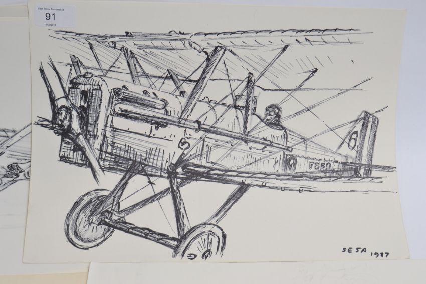 A selection of STUCKEY's sketches of planes and helicopters. All are unsigned and most are pen and ink. 36cm x26cm. From the extensive portfolio of artist Peter J Stuckey. The entire sale featuring watercolours / oils / sketches / inks / prints and other paintings. Known for his studies of planes, ships and cycles, the sale also features graphic design artwork from his time at Westingate House. Stuckey also designed many greetings cards and some packaging (usually for auto spares) His illustrations also featured as technical drawings and blueprints during his long career. POSTAGE; UK £12.99+VAT, EUROPE £15.99+VAT, WORLDWIDE SEE WEBSITE OR CONTACT US FOR QUOTE. COMBINED POSTAGE AVAILABLE.