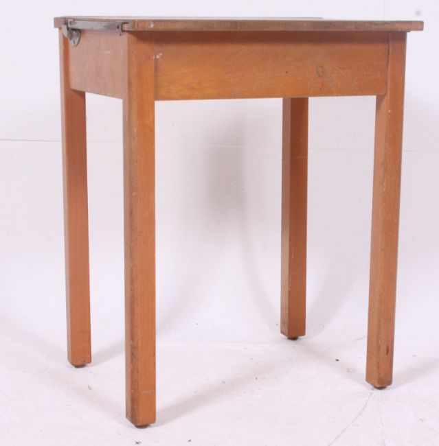 A vintage 1950's mid 20th century school desk with hinged top raised on squared supports. H79 xW56 x D46 cm