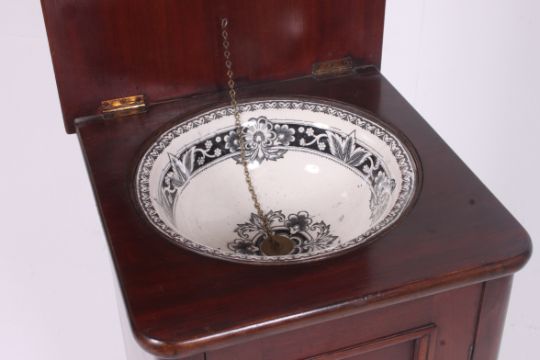 A Victorian mahogany pedestal wash stand. The hinged lid opening to reveal an aperture for original ceramic wash bowl complete with the brass plug on chain above cupboard base. H78 x W42 X D44 cm
