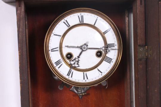 An Edwardan mahogany cased vienna regulator wall clock, stamped ' B ' in a carved case with glazed front. H53 x W32 x D18 cm