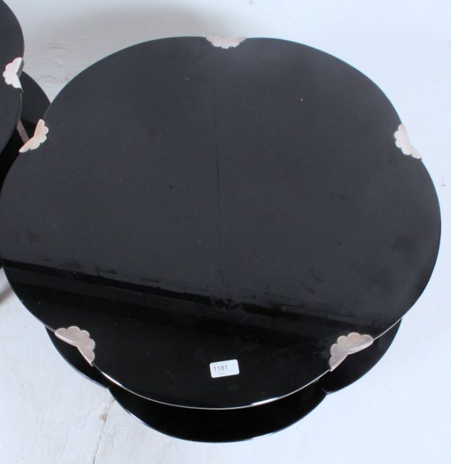 A pair of 1930's Art Deco black glass and chrome flower head shaped occasional coffee tables. Each raised on chrome supports having twin black glass shaped tops. H49 x W68 cm.